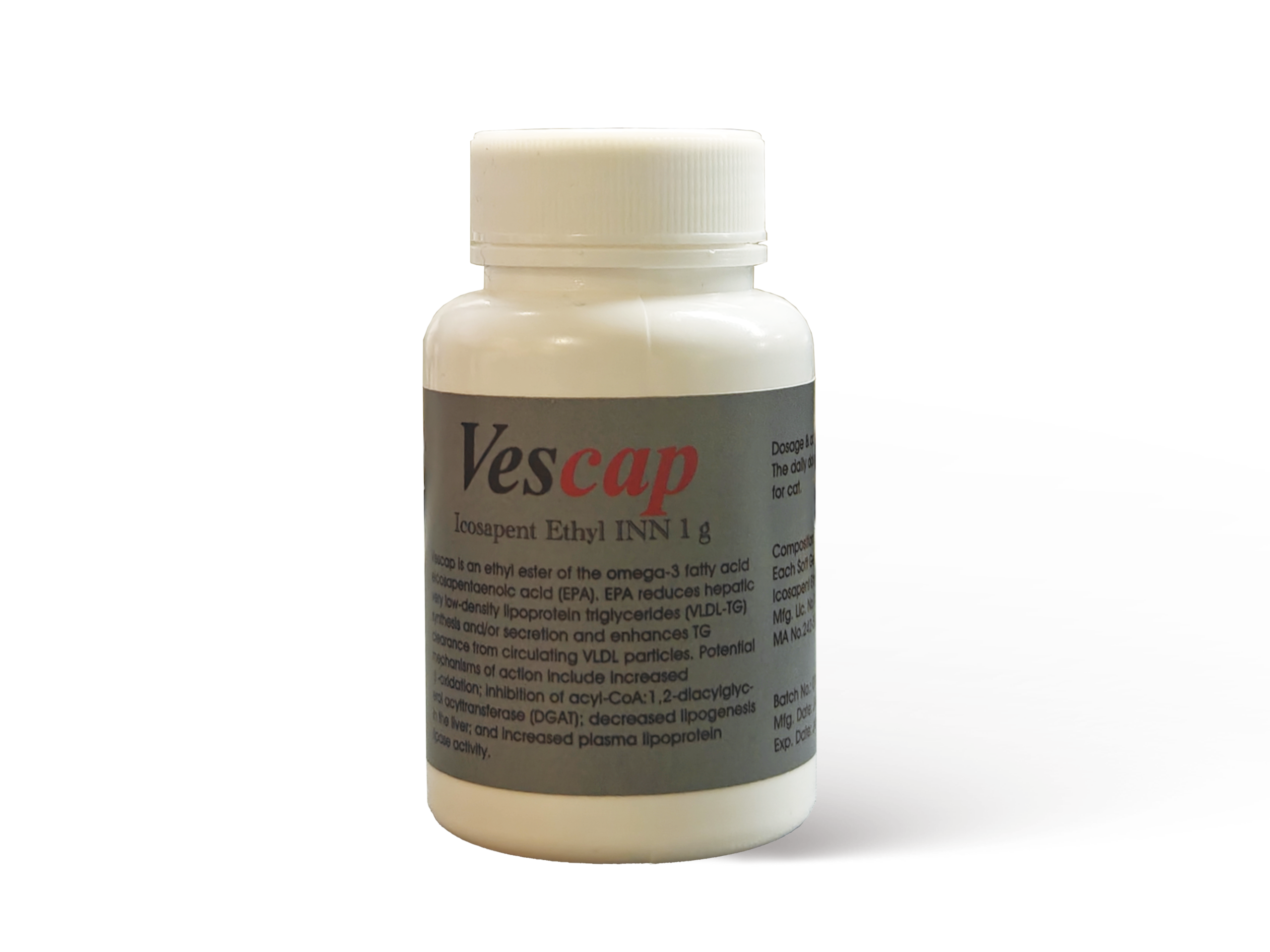 Vescap is an ethyl ester of the omega-3 fatty acid eicosapentaenoic acid (EPA). EPA reduces hepatic very low-density lipoprotein triglycerides (VLDL-TG) synthesis and/or secretion and enhances TG clearance from circulating VLDL particles. Potential mechanisms of action include increased β-oxidation; inhibition of acyl-CoA:1,2-diacylglycerol acyltransferase (DGAT); decreased lipogenesis in the liver; and increased plasma lipoprotein lipase activity.Dosage & administration: The daily dose of Vescap 1 capsule for cat.Composition:Each Soft Gelatin Capsule contains Icosapent Ethyl INN 1 g